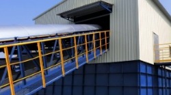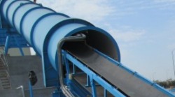 3.包覆式帶運機,就是將桁架式帶運機的遮雨蓋拿掉,改使用浪板包覆將整體桁架包裹起來,包覆性極高粉塵不易外露,且此型式可裝設窗戶使其通風,結合了砲管式及桁架式帶運機的優點也改善了它們的缺點。